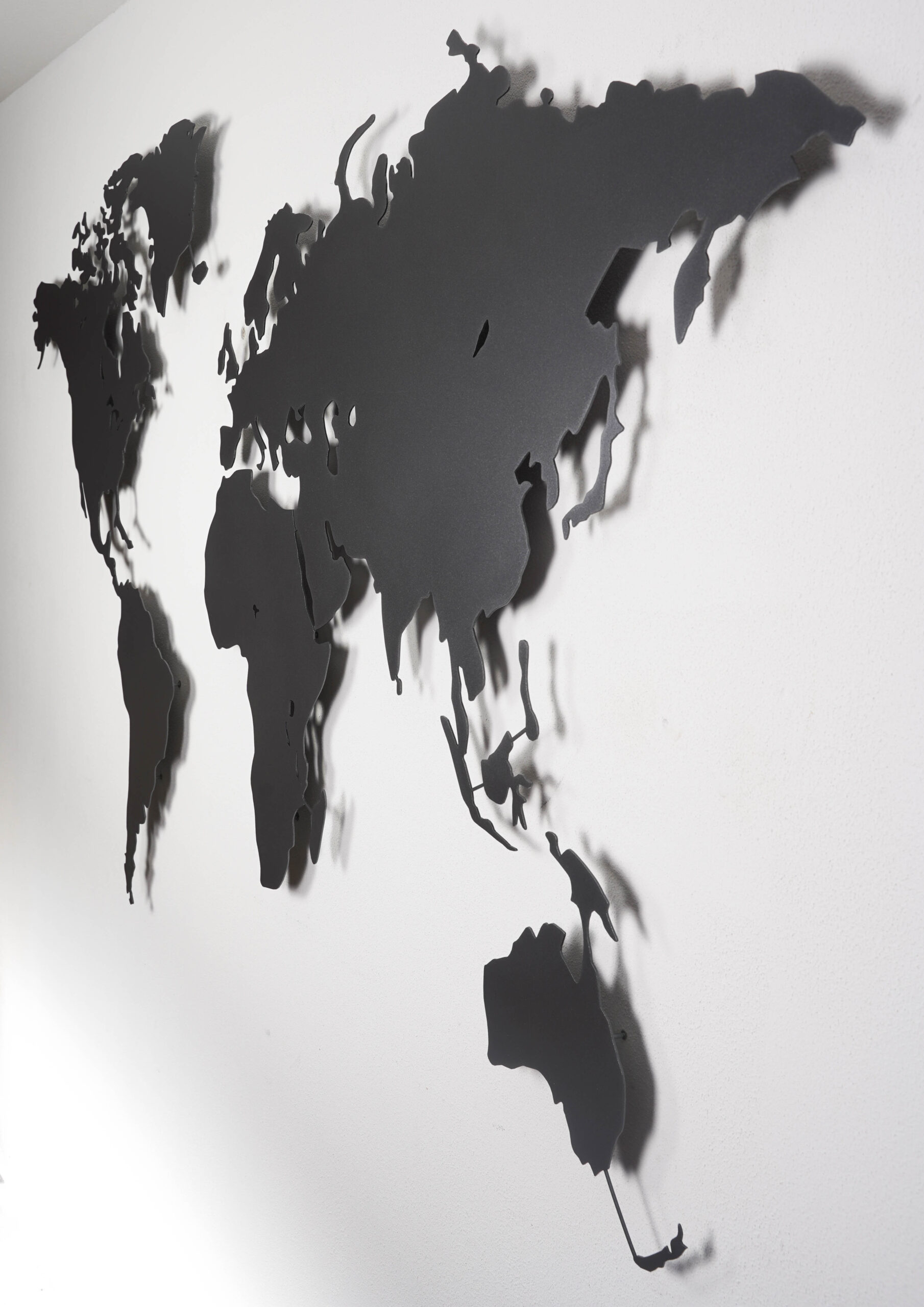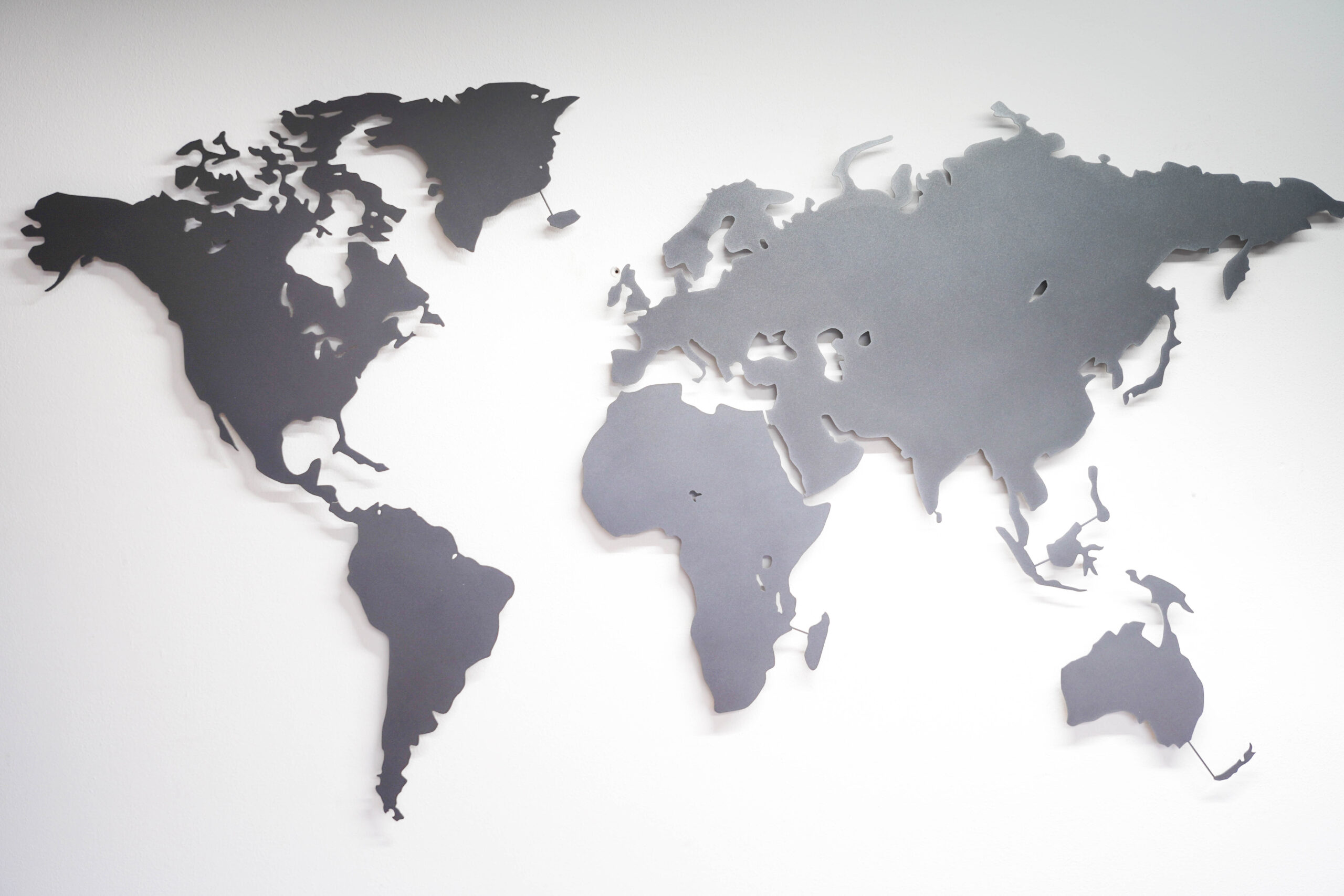 The steel world map in iron mica impresses with its elegant, subtly shimmering surface that is both modern and durable.