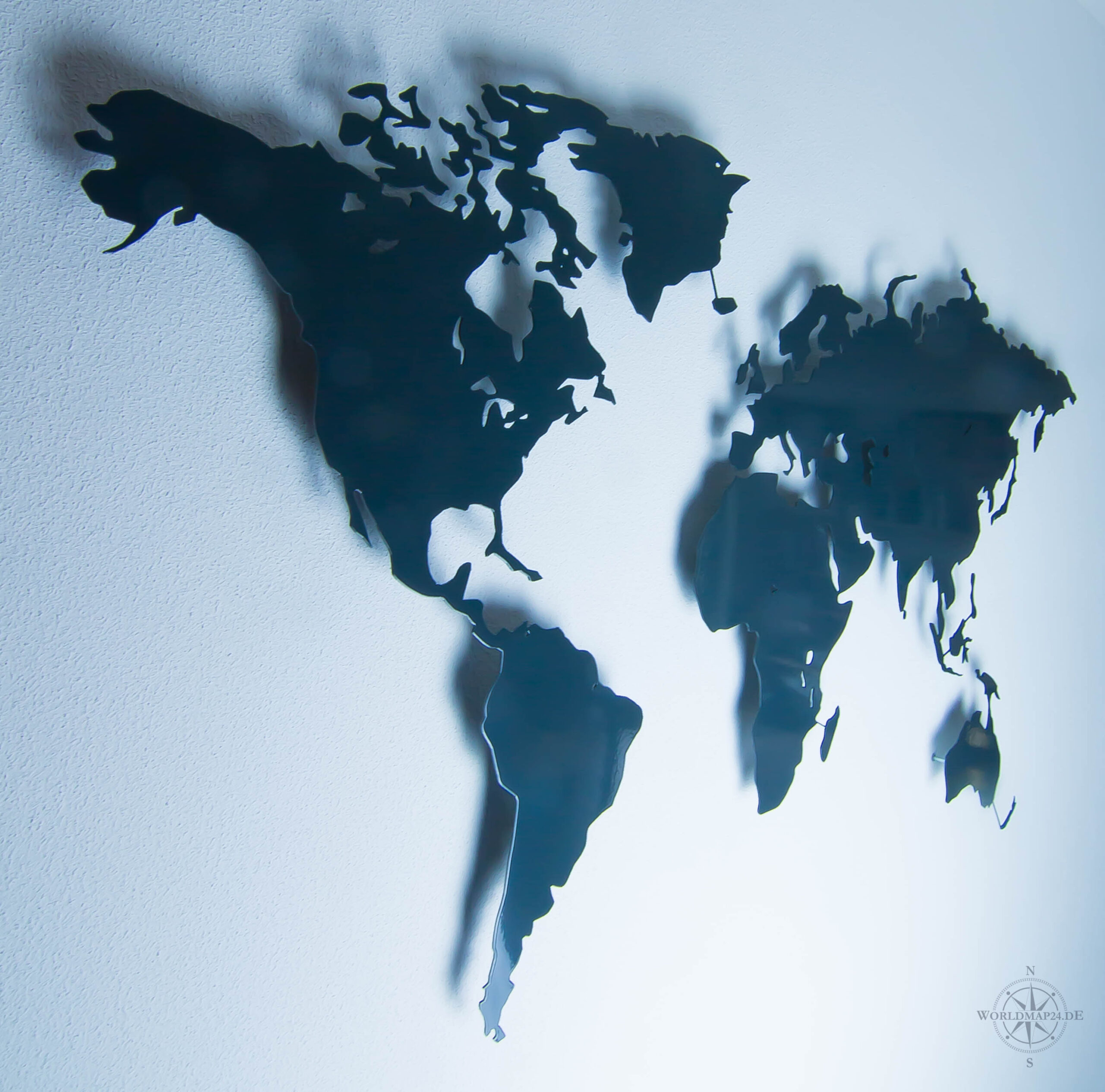 The steel world map in anthracite gray impresses with its elegant, glossy surface that is both modern and long-lasting.
